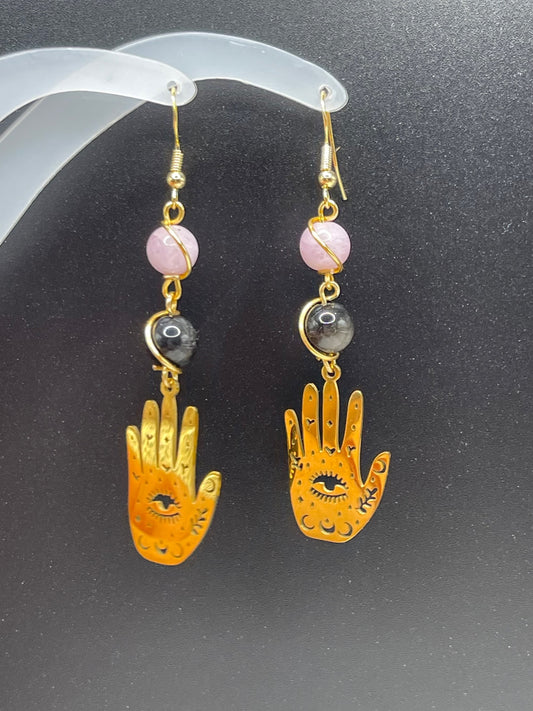 ✨ Divine Protection: Kunzite and Obsidian Gold Earrings with Evil Eye Hand Charm ✨