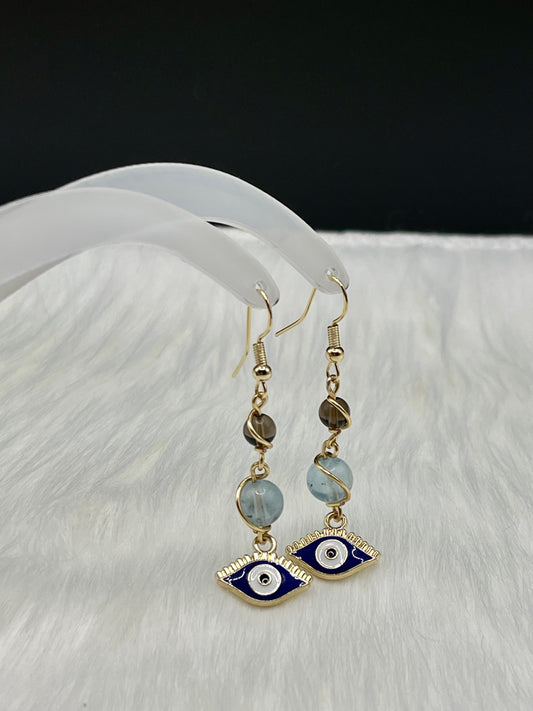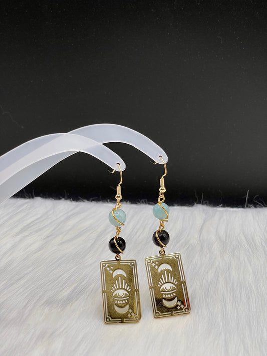 ✨ Eternal Serenity: Aquamarine and Silver Sheen Obsidian Gold Earrings with Evil Eye Tarot Charm ✨