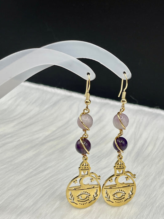 ✨ Mystical Elixir: Kunzite and Amethyst Gold Earrings with Evil Eye Potion Bottle Charm ✨