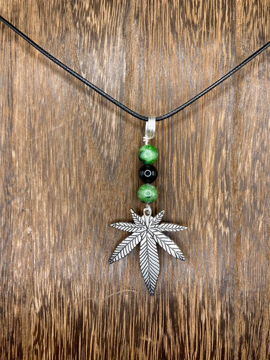 ✨ Nature’s Harmony: Ruby Zoisite and Obsidian Crystal Necklace with Marijuana Leaf Charm ✨